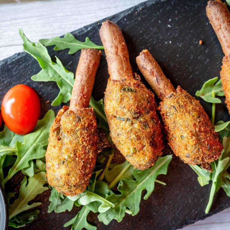 Minced vegetables wrapped around a bread stick; served with spicy red chili and scallion sauce